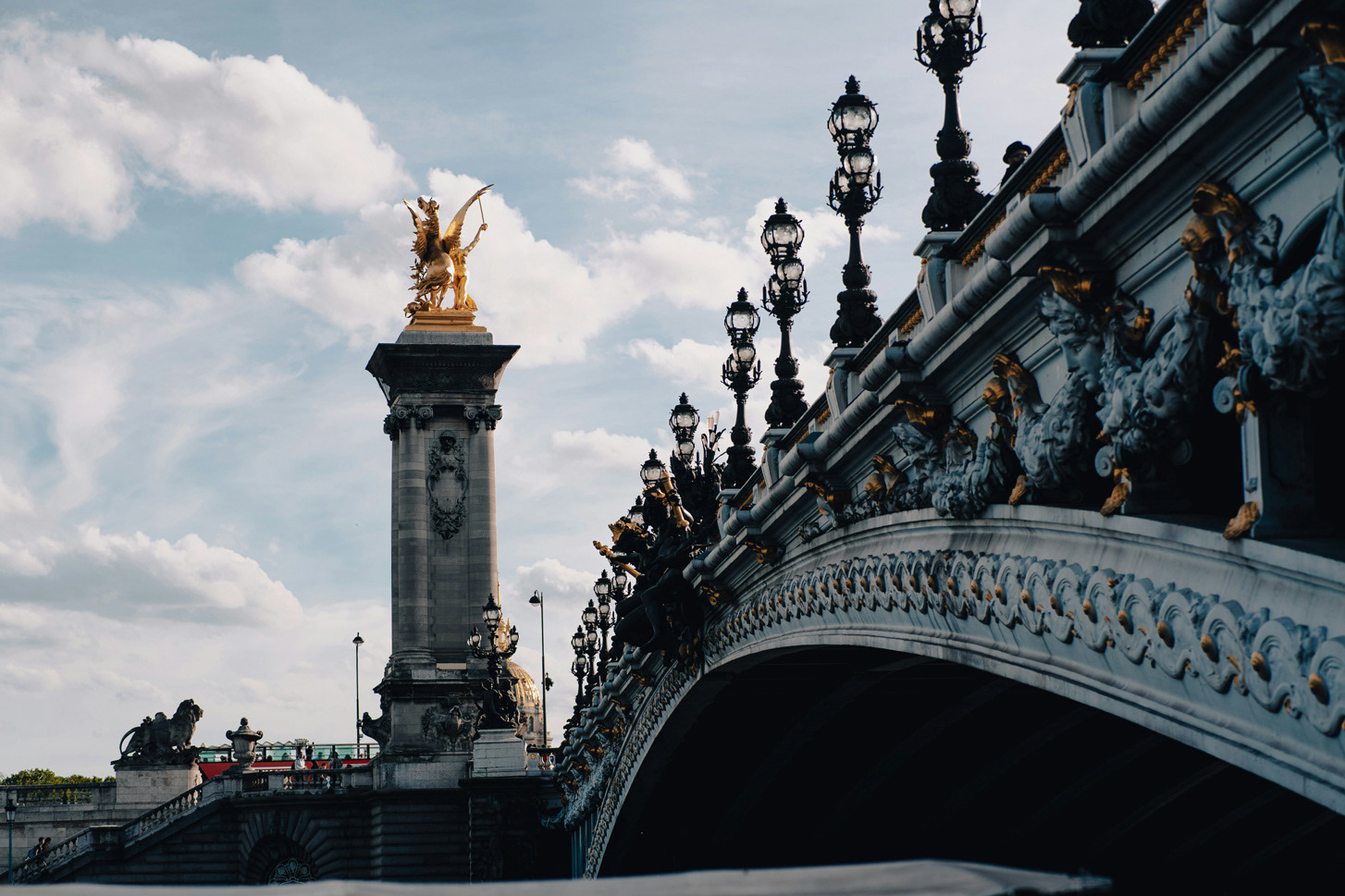 Propio del estilo “Beaux Arts” de la Tercera República Francesa, cruza el río Sena y une la explanada de “Los Inválidos” con el complejo monumental formado por este puente.